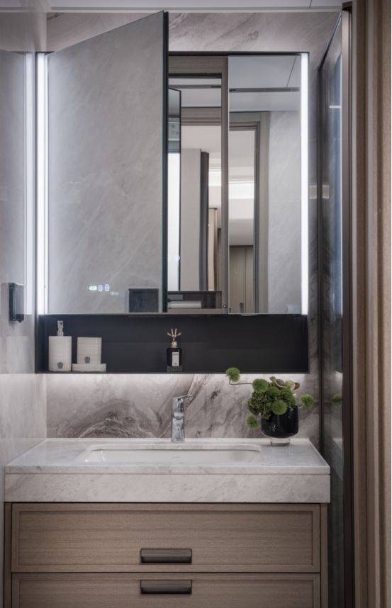 背后主墙面采用岩板策画,经久耐用,内部还收纳细节还预留4孔电源,电动牙刷、卷发棒等吹风机收纳孔、洗脸巾抽取孔。